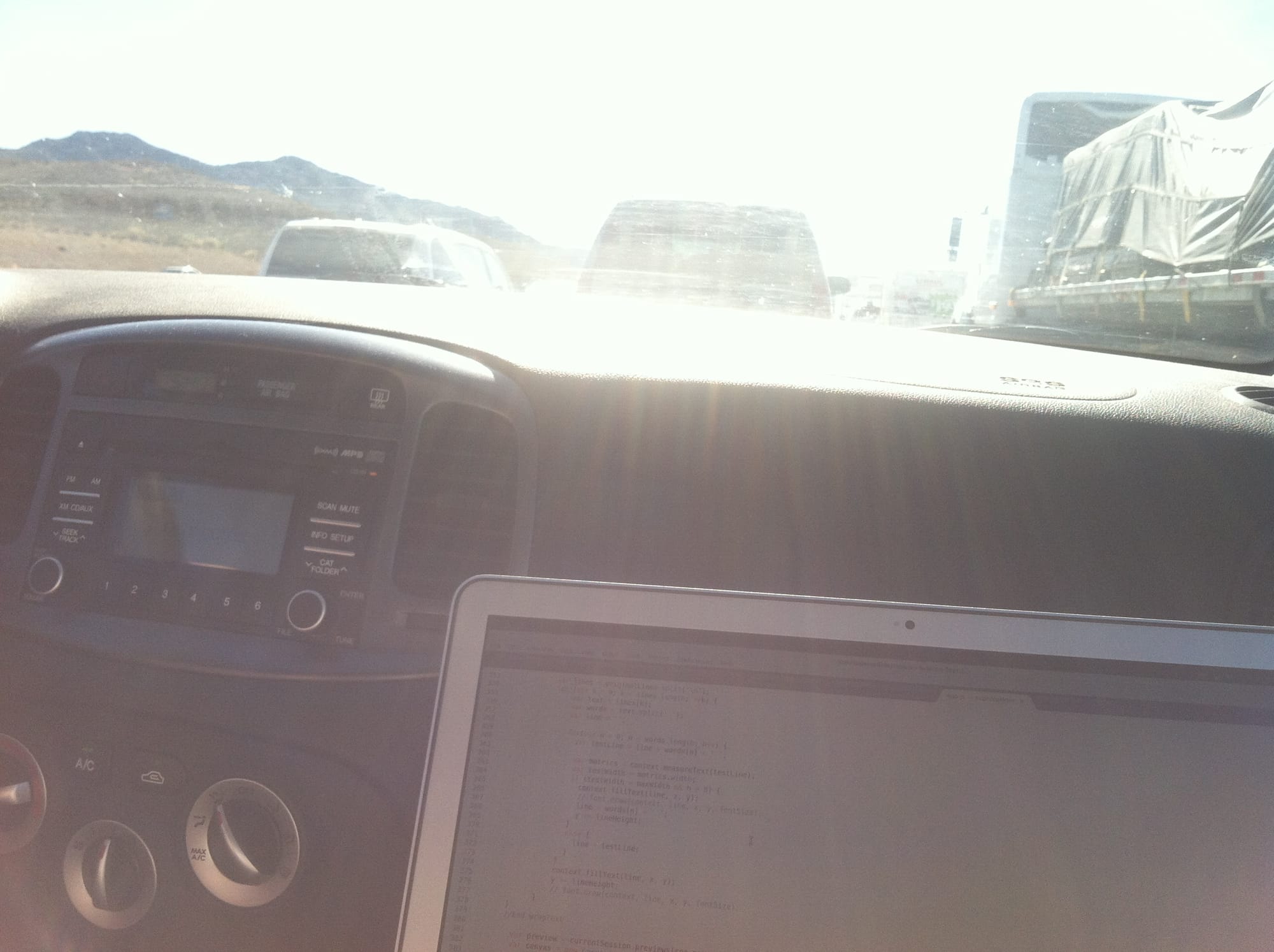 It's hard, if not impossible, to make out what's happening in this photo, but this is my attempt to get some urgent work done in the car while we rolled through some collision/fire related traffic along Interstate 15, just outside of Baker. What's you can't see in this photo is the look on my face as I simultaneously realize to very important facts: